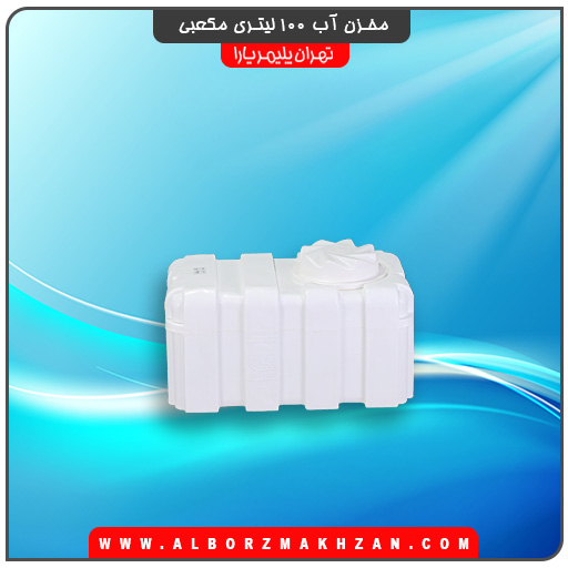 منبع آب مکعبی که جهت ذخیره سازی آب شرب مورد استفاده قرار می گیرد، به حالت افقی بوده و رنگ ان سفید می باشد. این مخزن آب دارای درب مشکی رنگ می باشد که جهت ورود و خروج مایعات تعبیه شده است. ارتفاع 43 سانتیمتر، عرض 45 سانتیمتر و طول 77 سانتی متر ابعاد این مخزن آب 100 لیتری را تشکیل می دهند.