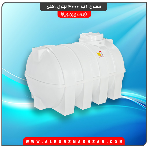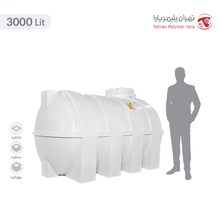 مخزن آب 3000 لیتری افقی (خوابیده) مناسب برای نگهداری طولانی مدت آب ساخته شده است. این مخازن از پلی اتیلن تأیید شده غذایی FDA / NSF ساخته شده و سه لایه بودن آن سبب جلوگیری از ورود نور خورشید و عدم ایجاد جلبک می شود. به همین خاطر آب در این مخزن هیچ تغییری از نظر مزه و طعم نمی کند. رنگ این مخزن سفید همراه با درب مشکی رنگ می باشد و به صورت یکپارچه و بدون درز ساخته می شود.
