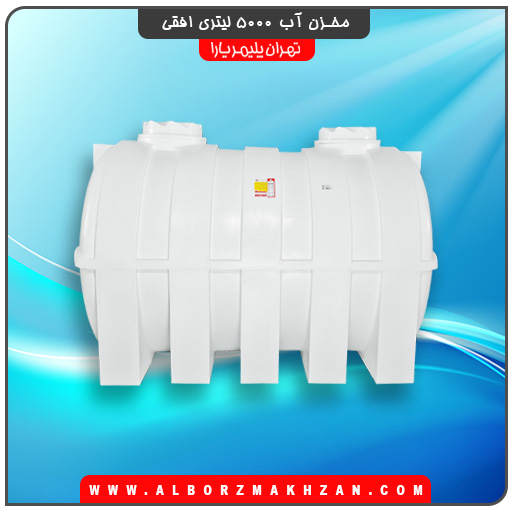 مخزن 5000 لیتری افقی، یک مخزن نگهداری آب سفید رنگ با درب مشکی از جنس پلی اتیلن به ابعاد: طول 266، عرض 167 و ارتفاع 172 سانتیمتر می باشد. علاوه بر سه لایه بودن و دارا بودن خصوصیت آنتی باکتریال و ضد جلبک بودن، دارای ویژگی های منحصربفرد دیگری هم می باشد. از جمله: داشتن وزن سبک و استحکام بالا، نصب و راه اندازی آسان، مقاومت در برابر خوردگی، بدون درز بودن و امکان حمل و نقل آسان